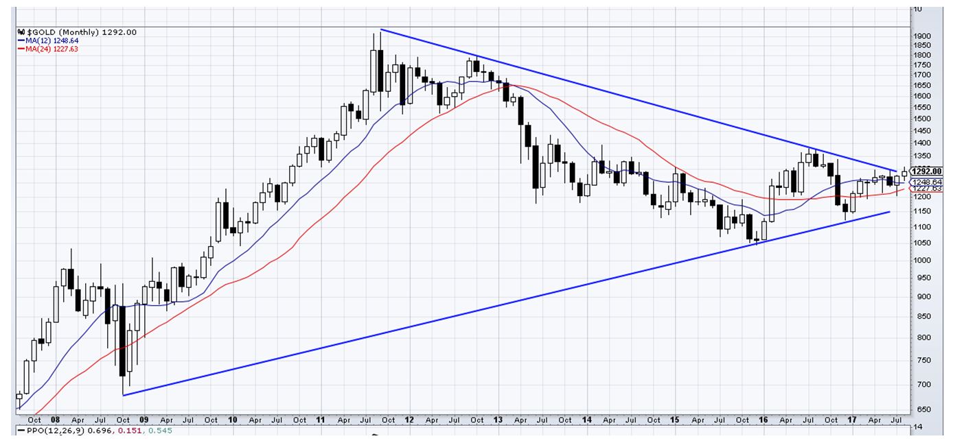 Ein Bild sagt mehr als 1.000 Worte, heißt es. In der Tat ist der Blick auf die langfristige Entwicklung von Gold sehr aufschlussreich (Chart seit 2008, 1 Kerze = 1 Monat). So hat das Metall mit seinen Hoch- und Tiefpunkten von 2008 bis 2017 ein bedeutsames symmetrisches Dreieck gebildet, wie die blauen Linien illustrieren. Ein solches Dreieck wird in 75 Prozent der Fälle in Richtung des übergeordneten Trends aufgelöst – und dieser Trend war in den Jahren 2000 bis 2011 klar aufwärts gerichtet, woran sich die Goldfans wehmütig erinnern.