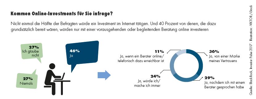 Die Bereitschaft, tatsächlich online zu investieren, ist jedoch noch nicht so weit verbreitet. 46 Prozent der befragten Deutschen können es sich vorstellen, den Abschluss im Internet zu tätigen. 27 Prozent sind da eher skeptisch, und weitere 27 Prozent sagen, dass sie dies niemals machen würden.