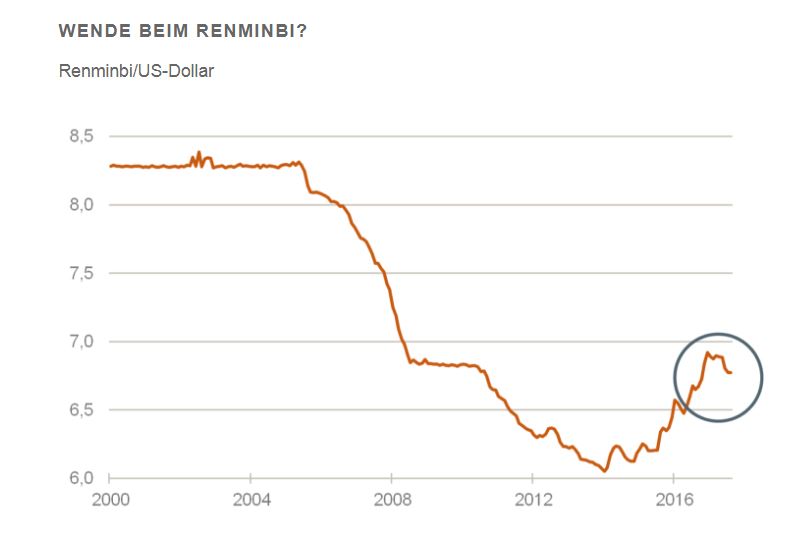 Die chinesische Währung beginnt, sich gegenüber dem US-Dollar wieder zu festigen (noch nicht gegenüber dem Euro). Damit geht die drei Jahre dauernde Schwäche der Währung zu Ende. Für Auslandsinvestoren in China ist das eine gute Nachricht, da sie von Aufwertungsgewinnen profitieren können. Aber auch für das Land selbst ist es nicht schlecht. Seine Exportindustrie braucht nicht die Unterstützung durch eine Abwertung. Die Handelsbilanz weist ohnehin einen großen Überschuss auf. Eine starke Währung unterstützt andererseits die politischen Bemühungen Pekings, den Renminbi im Kreis der Topwährungen der Welt zu etablieren. Vor einem Jahr war der Renminbi in den exklusiven Währungskorb der Sonderziehungsrechte des Internationalen Währungsfonds aufgenommen worden.