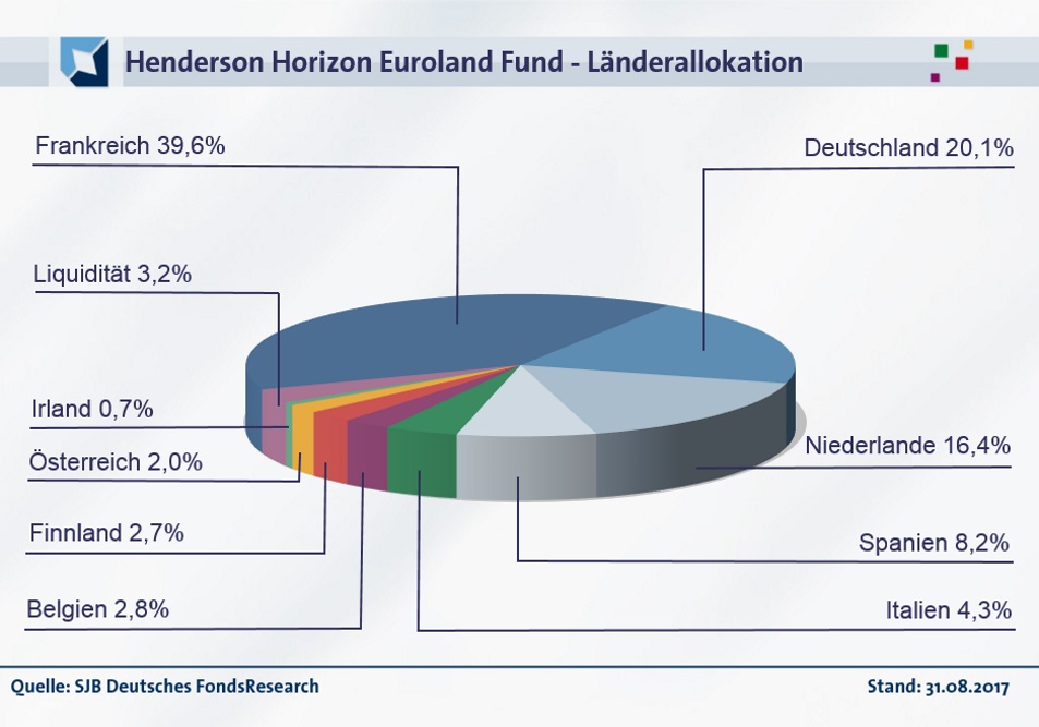 In der Länderallokation des Henderson Horizon Euroland Fund liegt Frankreich mit 39,6 Prozent Anteil am FondsVermögen auf Platz eins. Deutlich dahinter ist Deutschland platziert, wo 20,1 Prozent der FondsBestände investiert sind. Auf dem dritten Platz der Länderaufteilung befinden sich die Niederlande mit 16,4 Prozent des FondsVolumens. Aktien aus Spanien besitzen einen Portfolioanteil von 8,2 Prozent, Unternehmen aus Italien sind mit 4,3 Prozent gewichtet. FondsBestände in Belgien (2,8 Prozent) und Finnland (2,7 Prozent) ergänzen das Länderportfolio des Henderson-Produktes. Als weitere Beimischung sind Unternehmen aus Österreich (2,0 Prozent) sowie Irland (0,7 Prozent) vertreten. Per 31. August 2017 liegt die Liquiditätsquote des Fonds bei 3,2 Prozent.