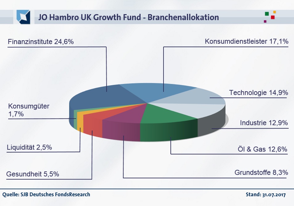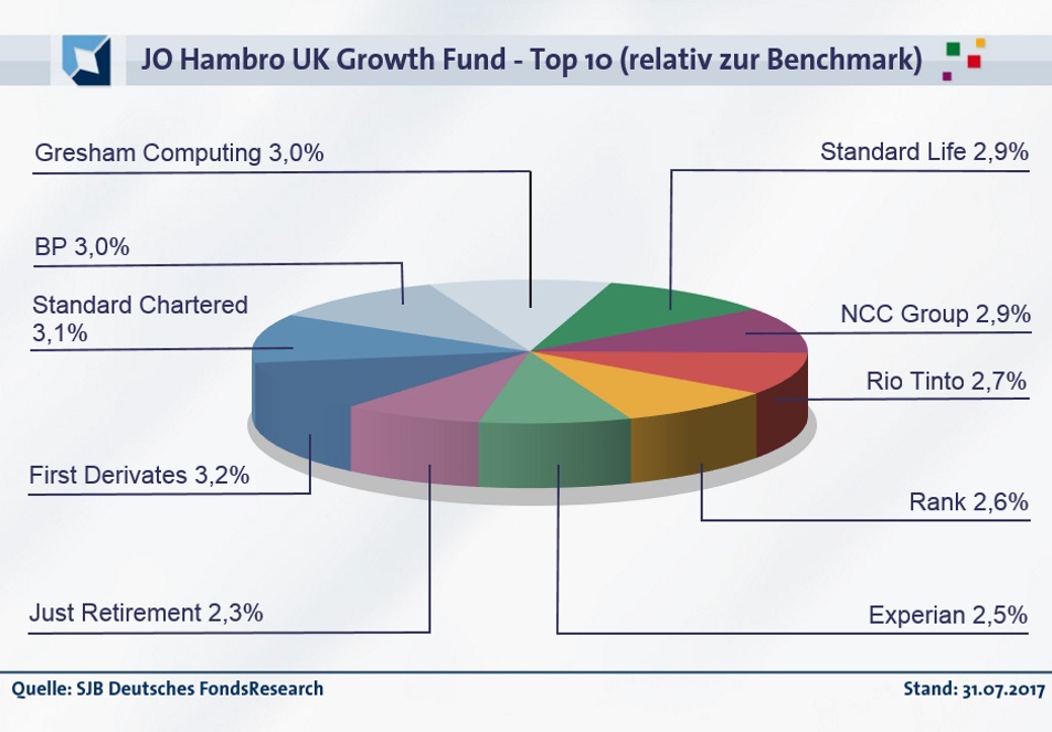 Bei der Branchenallokation des JO Hambro UK Growth Fund liegen Finanzinstitute mit 24,6 Prozent Portfolioanteil auf dem ersten Platz. Im Vergleich zur Benchmark FTSE All-Share TR Index erfahren diese eine Untergewichtung von 2,5 Prozent. Stärker als im FTSE-Referenzindex sind die nächsten zwei Sektoren des Großbritannien-Fonds gewichtet: Konsumdienstleister decken 17,1 Prozent des FondsVolumens ab (Übergewichtung von 6,0 Prozent), Technologiewerte repräsentieren 14,9 Prozent des FondsVermögens (14,0 Prozent Übergewichtung). Den vierten Platz in der Branchenstruktur des JO Hambro-Fonds nehmen Industrietitel mit 12,9 Prozent ein, Öl- und Gasaktien besitzen einen Anteil von 12,6 Prozent im Portfolio. Eine durchschnittliche Gewichtung innerhalb der Branchenaufteilung erfahren Grundstoffproduzenten (8,3 Prozent), Gesundheitsaktien sind mit 5,5 Prozent im Fonds vertreten. Konsumgütertitel (1,7 Prozent) dienen als Beimischung und sind gegenüber der Benchmark mit -14,1 Prozent klar unterrepräsentiert. Per Ende Juli verfügt der Fonds über eine Liquiditätsquote von 2,5 Prozent. Unter den Top 10 liegen Finanzwerte wie Standard Chartered und das Consulting-Unternehmen First Derivatives ganz vorn; zudem favorisiert FondsManager Costar den Spieleanbieter Rank Group. Aus dem Rohstoffsektor sind BP und Rio Tinto unter den Top 10 vertreten, ausgewählte Technologietitel wie die NCC Group oder der Informationsdienstleister Experian runden die Auswahl der am stärksten gewichteten Einzeltitel ab.