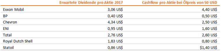 • Ein Vergleich der erwarteten Dividenden für 2017 mit dem freien Cashflow pro Aktie legt nahe, dass von den großen Playern nur Chevron und Shell Probleme haben, beim aktuellen Ölpreis ihre Dividende zu decken. Trotz zahlreicher Ölpreisrückgänge seit dem Zweiten Weltkrieg haben die großen Ölkonzerne ihre Dividenden nur selten gekürzt. Sowohl BP als auch ENI taten das zwei Mal, Shell, Exxon, Chevron und Statoil noch nie.