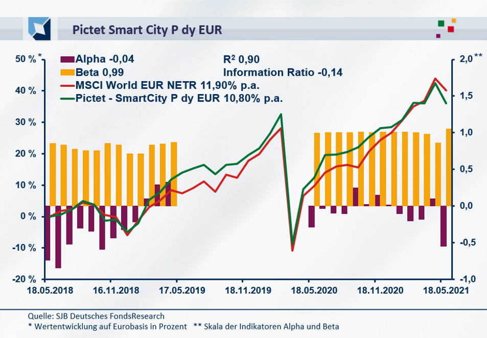 Per 18. Mai 2021 hat der Pictet Smart City über drei Jahre eine kumulierte Wertentwicklung von +37,11 Prozent in Euro aufzuweisen, was einer Rendite von +11,08 Prozent p.a. entspricht. Eine attraktive Performance, die in etwa auf einer Höhe mit der des MSCI World EUR NETR liegt: Der weltweit gestreute Aktienindex bringt es im selben Zeitraum auf eine Gesamtrendite von +40,14 Prozent in Euro bzw. ein Ergebnis von +11,90 Prozent jährlich. Beim Wechsel des Vergleichszeitraums auf ein Jahr fällt die Renditeentwicklung des Pictet-Produktes etwas zurück: Der aktiv gemanagte Fonds verzeichnet mit einer Wertsteigerung von +21,04 Prozent auf Eurobasis ein schwächeres Ergebnis als der passive MSCI-Vergleichsindex, der mit einem Plus von +27,67 Prozent aufwarten kann. Zu beachten ist bei den Performancezahlen allerdings: Während der Pictet-Fonds zugleich die Erfüllung von Nachhaltigkeitskriterien zur Aufnahmebedingung ins Portfolio macht, spielt beim MSCI World das ESG-Rating der enthaltenen Titel keine Rolle.