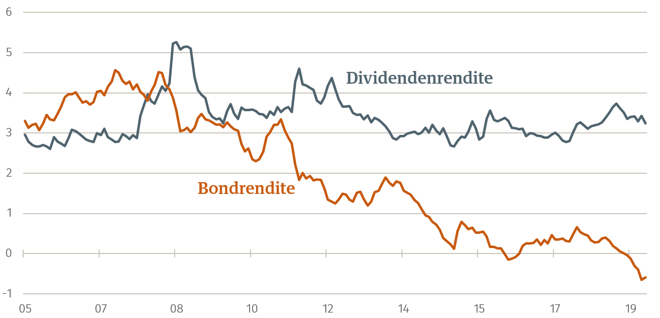 Bleiben Zwischenformen zwischen Bonds und Aktien. Eine ist, sich bei Aktien auf die Dividendenrendite zu fokussieren. Dividendenrenditen wurden in der Vergangenheit oft vernachlässigt, weil sie niedriger als die Bondrenditen waren. Die Grafik zeigt, dass das seit der großen Finanzkrise nicht mehr der Fall ist. Das Verhältnis Bonds zu Aktien hat sich auf den Kopf gestellt. Seitdem werfen die im DAX enthaltenen Aktien kontinuierlich stabile Renditen von 3 % bis 4 % ab. Ein ordentliches Ergebnis in Zeiten von Minuszinsen. Bondrenditen sind davon meilenweit entfernt. Sie waren zuletzt negativ. Dividendenrenditen schützen zwar nicht vor Kursrisiken, geben aber mehr Sicherheit als Plain Vanilla-Aktien.