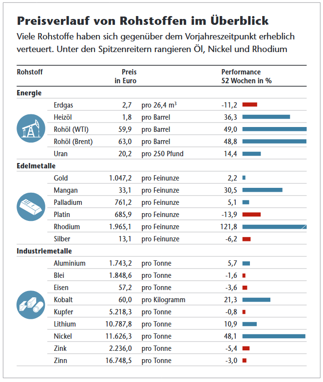Nicht nur Fischfett lässt sich derzeit gut verkaufen. Die Nachfrage nach den fossilen Energieträgern Öl und Gas bleibt trotz des Trends zu erneuerbarer Energie so hoch, dass sich neben Industriemetallen insbesondere Öl sprunghaft verteuert: Allein in den zurückliegenden zwölf Monaten ging der Preis für die Sorte Brent um 49 Prozent auf 63 Euro pro Fass nach oben.