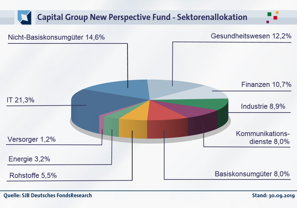 Bei der Branchengewichtung des weltweit engagierten Aktienfonds für neue Perspektiven befinden sich Titel der Informationstechnologie mit 21,3 Prozent Anteil am FondsVermögen auf dem ersten Platz. Aktien aus dem Bereich der Nicht-Basiskonsumgüter bringen es auf 14,6 Prozent des FondsVolumens, im Gesundheitswesen ist das FondsManagerteam um Lovelace und Watson mit 12,2 Prozent investiert. Finanztitel decken 10,7 Prozent der FondsBestände ab, der Anteil von Industriewerten liegt bei 8,9 Prozent. Auf gleicher Höhe befinden sich mit jeweils 8,0 Prozent die Bestände von Aktien aus dem Bereich der Basiskonsumgüter sowie Kommunikationsdienstleister. Abgerundet wird die Sektorenallokation des global gestreuten Aktienfonds durch Rohstoffaktien (5,5 Prozent), Energietitel (3,2 Prozent), sowie Versorgeraktien, die 1,2 Prozent des Anlagevermögens repräsentieren.