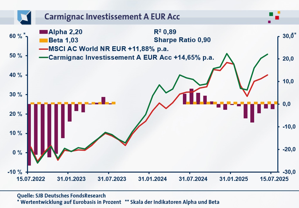 Per 15. Juli 2025 hat der Carmignac Investissement über drei Jahre eine kumulierte Wertentwicklung von +50,74 Prozent in Euro erzielt. Eine attraktive Performance, die einer Rendite von +14,65 Prozent p.a. entspricht. Damit fällt die Wertentwicklung des aktiv gemanagten FondsProduktes klar besser aus als diejenige des passiven Vergleichsindex MSCI AC World EUR NETR, der im Dreijahreshorizont eine Performance von +40,06 Prozent auf Eurobasis bzw. eine Rendite p.a. von +11,88 Prozent generiert. Auch kurzfristig liegt der Carmignac-Fonds mit seiner Wertentwicklung vor dem weltweiten Aktienmarkt: Über ein Jahr hat FondsManager Barrett mit seinem Aktienportfolio eine Performance von +6,53 Prozent in Euro zu verzeichnen, während der MSCI-Referenzindex ein Plus von +5,89 Prozent generierte. Die in beiden untersuchten Zeithorizonten erzielte Mehrrendite macht das Carmignac-Produkt zum klaren Sieger im Performancewettbewerb mit der MSCI-Benchmark – fallen die Alpha-Werte entsprechend positiv aus?