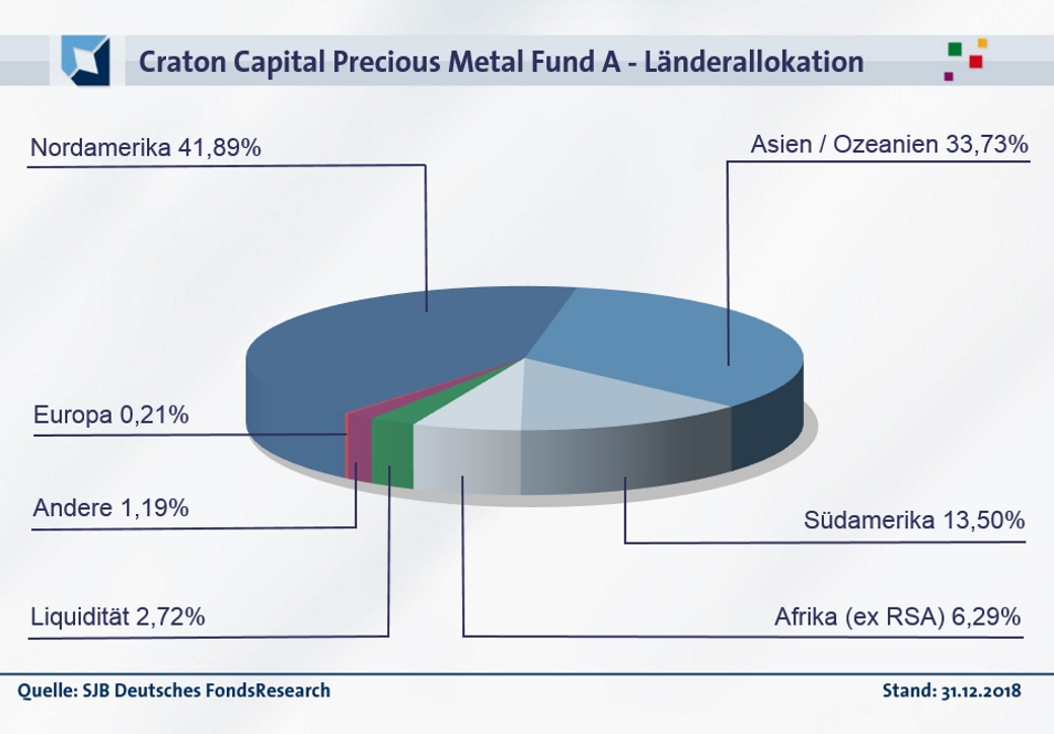 Bei der geographischen Allokation des Craton Capital Precious Metal Fund liegt Nordamerika mit 41,89 Prozent vorn, wo in den USA oder Kanada viele der größten Gold- und Silberproduzenten ihren Sitz haben. 33,73 Prozent des FondsVolumens sind in Asien und Ozeanien angelegt, 13,50 Prozent des Portfolios hat FondsManager Bachmann in Südamerika investiert. Afrikanische Aktien (ohne Südafrika) machen 6,29 Prozent der Bestände des Edelmetallaktien-Fonds aus, europäische Titel repräsentieren mit 0,21 Prozent nur einen sehr geringen Anteil des Portfolios. Positionen in anderen Ländern in Höhe von 1,66 Prozent runden die geographische Zusammensetzung des Craton-Fonds ab. Der Cashbestand liegt per Ende Dezember 2018 bei 2,72 Prozent. In der Branchengewichtung dominieren Goldminenaktien mit einem Anteil von 81,22 Prozent das FondsPortfolio. Silberproduzenten sind in dem Fonds mit 13,24 Prozent gewichtet, weitere Edelmetallaktien bringen es auf 2,82 Prozent. Unter den Top-Holdings des Fonds liegen aktuell die beiden kanadischen Unternehmen Argonaut Gold und Atlantic Gold Corp ganz vorn. Weitere günstig bewertete Goldförderunternehmen wie die beiden australischen Goldproduzenten Gold Road Resources und Northern Star Resources befinden sich unter den zehn größten Einzelpositionen im Portfolio. Die im Abitibi-Goldgürtel von Quebec aktive Osisko Mining Corp sowie das in Kanada ansässige Bergbauunternehmen Kirkland Lake Gold runden die Top-10-Positionen des Craton-Fonds ab.