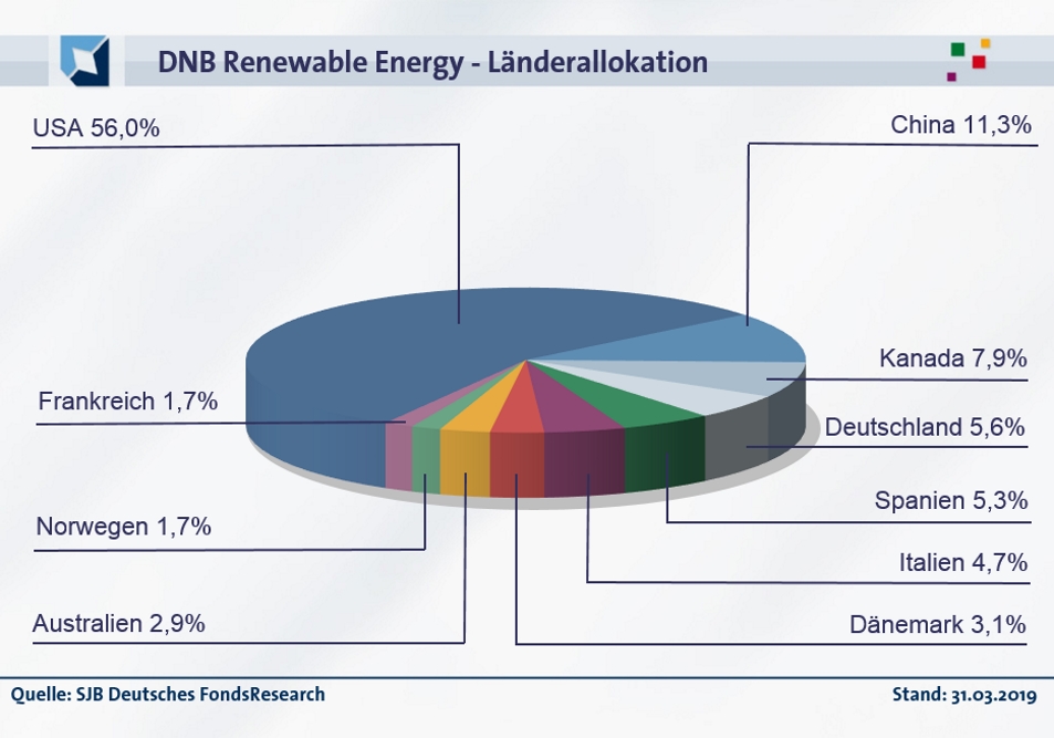 Die Aktien im Portfolio des DNB Renewable Energy sind schwerpunktmäßig in den USA beheimatet (56,0 Prozent des FondsVermögens). Den zweiten Platz in der Länderallokation belegt China, wo 11,3 Prozent der Anlegergelder investiert sind. Aktien aus Kanada nehmen 7,9 Prozent des FondsVolumens ein, Unternehmen aus Deutschland besitzen eine Gewichtung von 5,6 Prozent. Aus Spanien stammen 5,3 Prozent der Wertpapiere des DNB-Produktes, während 4,7 Prozent des Portfolios in Italien beheimatet sind. Umwelttechnologieunternehmen aus Dänemark sind mit 3,1 Prozent im DNB Renewable Energy vertreten. Aktien aus Australien (2,9 Prozent), Norwegen und Frankreich (jeweils 1,7 Prozent) runden das Länderportfolio ab.