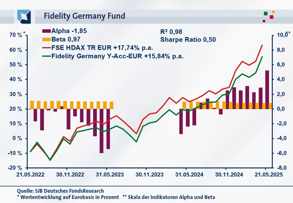 Per 21. Mai 2025 hat der Fidelity Germany Fund über drei Jahre eine kumulierte Wertentwicklung von +55,48 Prozent in Euro aufzuweisen, was einer Rendite von +15,84 Prozent p.a. entspricht. Eine attraktive Performanceleistung, die vom FSE HDAX TR EUR als Vergleichsindex noch leicht übertroffen wird: Die SJB-Benchmark verzeichnet eine Performance von +63,24 Prozent auf Eurobasis, was einem Ergebnis von +17,74 Prozent p.a. gleichkommt. Beim Wechsel auf die Jahresbetrachtung übernimmt der Fidelity-Fonds die Führung und kann einen Renditevorsprung zum Referenzindex generieren: Mit einer Jahresrendite von +28,88 Prozent in Euro fällt die Wertentwicklung des Fidelity-Produktes nunmehr besser als die des Kursbarometers für den breiten deutschen Aktienmarkt von +26,36 Prozent aus. Die über zweiprozentige Mehrrendite, die kurzfristig gegenüber dem ohnehin schon sehr gut gelaufenen Gesamtmarkt erzielt wird, dient als klarer Qualitätsbeweis für die Stockpicking-Strategie der Fidelity-FondsManager. Wie fallen die Alpha-Werte des Deutschland-Fonds aus?