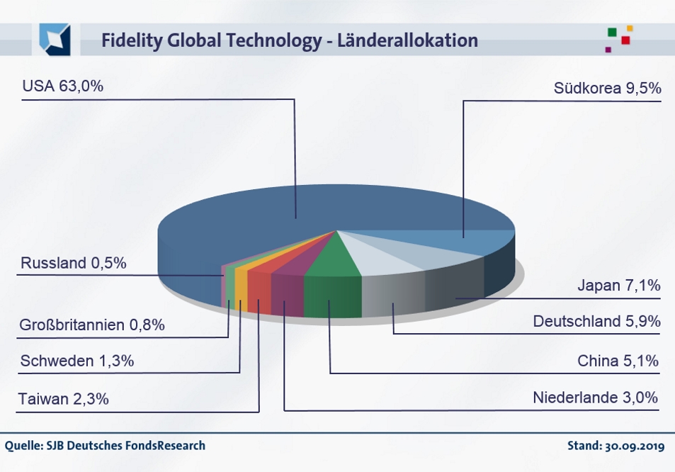 In der Länderallokation des Fidelity Global Technology Fund liegen die USA mit 63,0 Prozent Anteil am FondsVermögen unangefochten auf Platz eins. Klar dahinter folgt Südkorea, wo 9,5 Prozent der FondsBestände investiert sind. Auf dem dritten Platz der Länderaufteilung des Technologiefonds liegt Japan mit 7,1 Prozent des FondsVolumens. Aktien aus Deutschland besitzen einen Portfolioanteil von 5,9 Prozent, Dividendentitel aus China sind mit 5,1 Prozent gewichtet. FondsBestände in den Niederlanden (3,0 Prozent), Taiwan (2,3 Prozent) und in Schweden (1,3 Prozent) ergänzen das Länderportfolio des Fidelity-Produktes. Komplettiert wird die Titelauswahl durch Firmen mit Sitz in Großbritannien (1,0 Prozent) sowie Russland (0,5 Prozent).