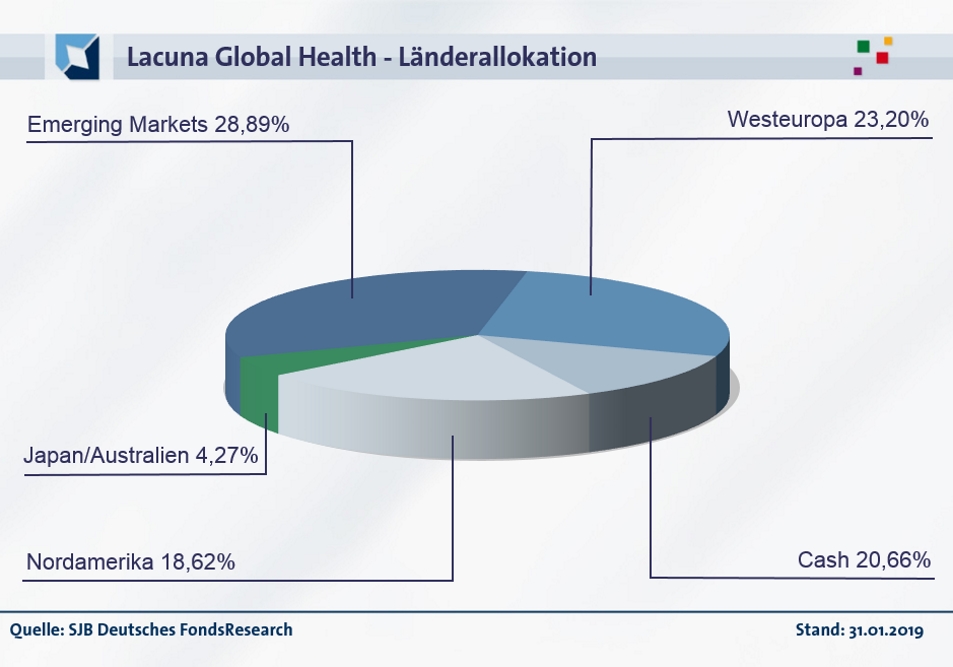 In der Länderallokation des Lacuna Global Health liegen die Emerging Markets mit 28,89 Prozent Anteil am FondsVermögen auf Platz eins. Die Schwerpunkte setzt FondsManager Engelhardt in den beiden aufstrebenden asiatischen Ländern China und Indien. Als zweitgrößte geographische Position folgt Westeuropa mit 23,20 Prozent, in Nordamerika sind aktuell 18,62 Prozent der FondsBestände investiert. Auf Platz vier der Länderaufteilung befindet sich der asiatisch-pazifische Raum mit Japan und Australien, der 4,27 Prozent des FondsVolumens abdeckt. Angesichts der volatilen Situation an den Aktienmärkten hält Engelhardt derzeit eine hohe Cashposition von 20,66 Prozent.