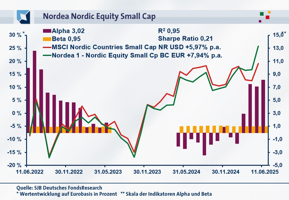 Per 11. Juni 2025 hat der Nordea – Nordic Equity Small Cap Fund über drei Jahre eine kumulierte Wertentwicklung von +25,76 Prozent auf Eurobasis aufzuweisen, was einer Rendite von +7,94 Prozent p.a. entspricht. Dieses attraktive Performance-Ergebnis übertrifft die Wertentwicklung des MSCI Nordic Countries Small Cap deutlich: Der Referenzindex für den skandinavischen Small-Cap-Sektor wartet mit einer Gesamtrendite von +19,02 Prozent in Euro bzw. einem Ergebnis von +5,97 Prozent jährlich auf. Beim Wechsel des Vergleichszeitraums auf ein Jahr ist ebenfalls ein klarer Performancevorsprung des Nordea Nebenwerte-Fonds vor der MSCI-Benchmark zu konstatieren. Mit einer Wertentwicklung von +9,81 Prozent in Euro fällt die Rendite des Nordea-Produktes über fünf Prozentpunkte besser als beim MSCI Nordic Countries Small Cap aus (+4,24 Prozent). In Kombination mit der im längerfristigen Zeithorizont erzielten Mehrrendite von gut sechs Prozentpunkten ist der Sieger im direkten Performancevergleich klar: Der Nordic Equity Small Cap Fund von Nordea belegt den ersten Platz, da er gegenüber dem MSCI-Referenzindex mit einem substanziellen Renditevorsprung aufwarten kann.