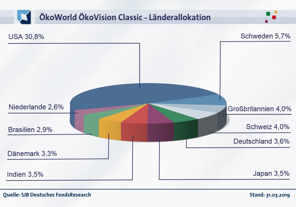 In der Länderallokation des ÖkoWorld ÖkoVision Classic liegen die USA mit 30,8 Prozent Anteil am FondsVermögen mit großem Abstand auf Platz eins. Dahinter folgt Schweden, wo 5,7 Prozent der FondsBestände investiert sind. Den dritten Platz in der Länderaufteilung des Öko-Fonds teilen sich Großbritannien und die Schweiz mit jeweils 4,0 Prozent des FondsVolumens. Aktien aus Deutschland besitzen einen Portfolioanteil von 3,6 Prozent, Dividendentitel aus Japan und Indien sind beide mit 3,5 Prozent gewichtet. FondsBestände in Dänemark (3,3 Prozent) ergänzen das Länderportfolio des ÖkoWorld-Produktes. Abgerundet wird die Titelauswahl durch Firmen mit Sitz in Brasilien (2,9 Prozent) und den Niederlanden (2,6 Prozent). Sonstige Länder mit einem Bestand von 17,3 Prozent komplettieren das Portfolio. Per 31. März 2019 nimmt die Kasseposition des Fonds gemeinsam mit den Anleiheprodukten 18,8 Prozent des FondsVermögens ein.