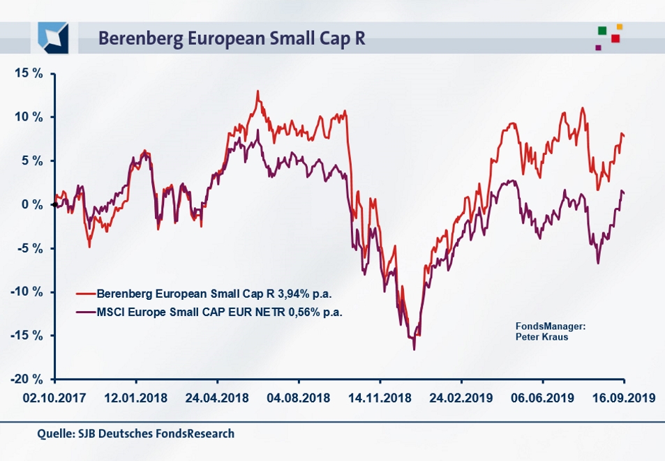 Wer als Anleger innovative Unternehmen mit deutlich überdurchschnittlichen Wachstumsraten sucht, sollte sich im europäischen Nebenwerte-Sektor umsehen. Mit Small Caps aus Europa lassen sich überdurchschnittliche Renditen erzielen, langfristig liegt deren Wertentwicklung deutlich über der von Standardwerten. Mit seinem aktiven, fundamental basierten Stock-Picking-Prozess ist der Berenberg European Small Cap das richtige Investmentvehikel, um von diesem aussichtsreichen Anlagesektor zu profitieren. Die erfolgreiche Titelselektion von FondsManager Peter Kraus sorgt dafür, dass der Berenberg-Fonds seit Auflage eine attraktive Mehrrendite zum Vergleichsindex aufweist.