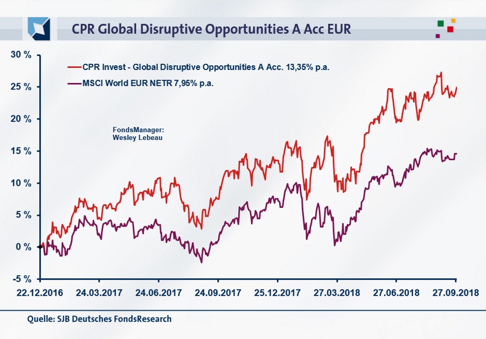 In den knapp zwei Jahren seit seiner Auflegung hat der CPR Global Disruptive Opportunities A Acc EUR eine Rendite von +13,35 Prozent p.a. in Euro erzielt (Stichtag: 28. September 2018). Eine beeindruckende Performance, die zudem deutlich besser als die des MSCI World EUR NETR ausfällt. Der weltweit anlegende Aktienindex, den die SJB für ihre FondsAnalyse als Benchmark ausgewählt hat, kommt im selben Zeitraum auf eine Rendite von lediglich +7,95 Prozent p.a. auf Eurobasis. Die Outperformance des CPR-Fonds setzt sich im kurzfristigen Renditevergleich fort: Über ein Jahr hat der Fonds eine Wertentwicklung von +14,64 Prozent in Euro zu verzeichnen, während der MSCI World eine Rendite von +12,14 Prozent erwirtschaften konnte. Der Performancevorsprung zwischen 2,5 und 5,4 Prozentpunkten spricht eine deutliche Sprache: Mit seiner in beiden Analysezeiträumen erzielten Mehrrendite ist der aktiv gemanagte CPR-Fonds Gesamtsieger im Performancevergleich und liegt gegenüber dem breiten globalen Aktienmarkt klar vorn.