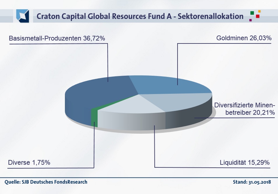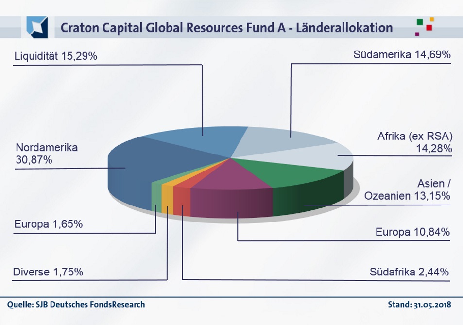 In der geographischen Allokation des Craton Capital Global Resources Fund liegt Nordamerika mit 25,91 Prozent auf dem ersten Platz. 14,69 Prozent des FondsVolumens sind in südamerikanische Aktien investiert, 14,28 Prozent des Portfolios hat FondsManager Bachmann in afrikanische Rohstofftitel (ohne Südafrika) angelegt. 13,15 Prozent des Rohstoffaktien-Fonds werden in Titeln aus Asien und Ozeanien gehalten, 10,84 Prozent des FondsVermögens sind in Aktien aus diversen Ländern weltweit investiert. Rohstoff- und Minenwerte aus der Republik Südafrika repräsentieren 2,44 Prozent der FondsBestände. Andere Vermögenswerte in Höhe von 1,75 Prozent runden das Portfolio des Craton-Fonds ab. Der Cashbestand liegt per Ende Mai 2018 bei hohen 15,29 Prozent. In der Branchengewichtung dominieren die Produzenten von Basismetallen mit einem Anteil von 36,72 Prozent, gefolgt von den Goldminentiteln im FondsPortfolio (28,18 Prozent). Diversifizierte Minenbetreiber sind in dem Fonds mit 20,21 Prozent gewichtet, andere Sektoren bringen es auf 1,75 Prozent. Unter den Top 10 des Fonds befinden sich der in den Bereichen Platin, Kupfer, Eisenerz und Mangan tätige britische Rohstoff-Konzern Anglo American sowie das kanadische Bergbau-Unternehmen First Quantum Minerals (Erze, Kupfer und Gold). Günstig bewertete Goldförderunternehmen wie die kanadische Torex Gold Resources oder der ebenfalls in Kanada beheimatete Zinkproduzent Trevali Mining Corp komplettieren die Portfoliostruktur.