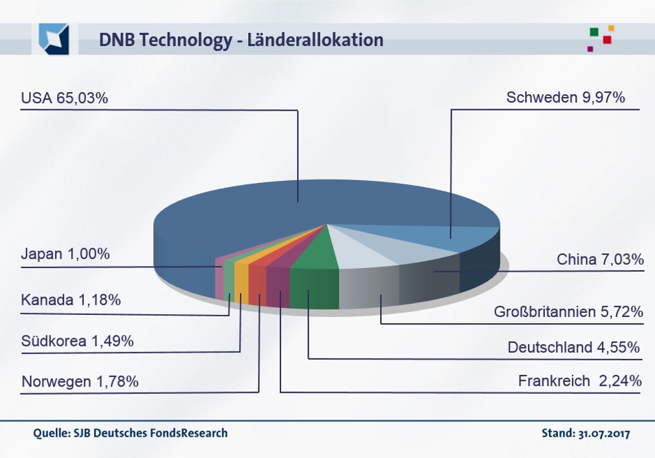 Die Aktien im Portfolio des DNB Technology sind zu rund zwei Dritteln in den USA beheimatet (65,03 Prozent). Den zweiten Platz in der Länderallokation belegt Schweden, wo 9,97 Prozent des FondsVermögens investiert sind. Aktien aus China nehmen 7,03 Prozent des FondsVolumens ein, in Großbritannien sind 5,72 Prozent des Portfolios investiert. 4,55 Prozent der Bestände werden von Unternehmen aus Deutschland repräsentiert, Technologiefirmen aus Frankreich liegen mit 2,24 Prozent dahinter. Norwegen (1,78 Prozent) und Südkorea (1,49 Prozent) besitzen den Status einer Beimischung, Aktien aus Kanada (1,18 Prozent) und Japan (1,00 Prozent) runden das Länderportfolio ab. Die Sektorengewichtung des DNB-Fonds setzt einen klaren Schwerpunkt: Technologietitel bilden mit 85,39 Prozent das Rückgrat des Fonds, zyklische Konsumwerte nehmen 5,12 Prozent der FondsBestände ein. Zudem werden dem Portfolio kleinere Bestände von Industrietiteln (3,81 Prozent), Telekommunikationswerten (3,26 Prozent) sowie Finanzdienstleistern (2,42 Prozent) beigemischt.