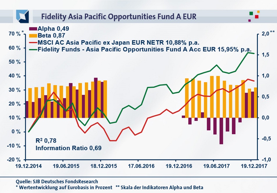 Per 19. Dezember 2017 hat der Fidelity Asia Pacific Opportunities Fund über drei Jahre eine kumulierte Wertentwicklung von +55,95 Prozent in Euro aufzuweisen, was einer Rendite von +15,95 Prozent p.a. entspricht. Dies ist eine weit bessere Wertentwicklung als beim MSCI AC Asia Pacific (ex Japan) EUR NETR: Die SJB-Benchmark wartet über drei Jahre mit einer Gesamtrendite von +36,37 Prozent auf Eurobasis auf, die einem jährlichen Ergebnis von +10,88 Prozent gleichkommt. Beim Wechsel auf die Jahresbetrachtung liegt das Fidelity-Produkt erneut auf dem ersten Platz, wenngleich sich der Renditevorsprung gegenüber dem Referenzindex etwas verringert: Mit einer Jahresrendite von +21,55 Prozent in Euro fällt die Performance des Asien-Pazifik-Fonds weiter über drei Prozentpunkte höher als die des MSCI-Vergleichsindex von +18,45 Prozent aus. Insgesamt ist das Performanceergebnis von FondsManager Srom als sehr positiv zu klassifizieren: Die in beiden Zeithorizonten erzielte attraktive Mehrrendite gegenüber der MSCI-Benchmark beweist, dass der Aktienexperte mit seiner Titelselektion überwiegend richtig liegt.