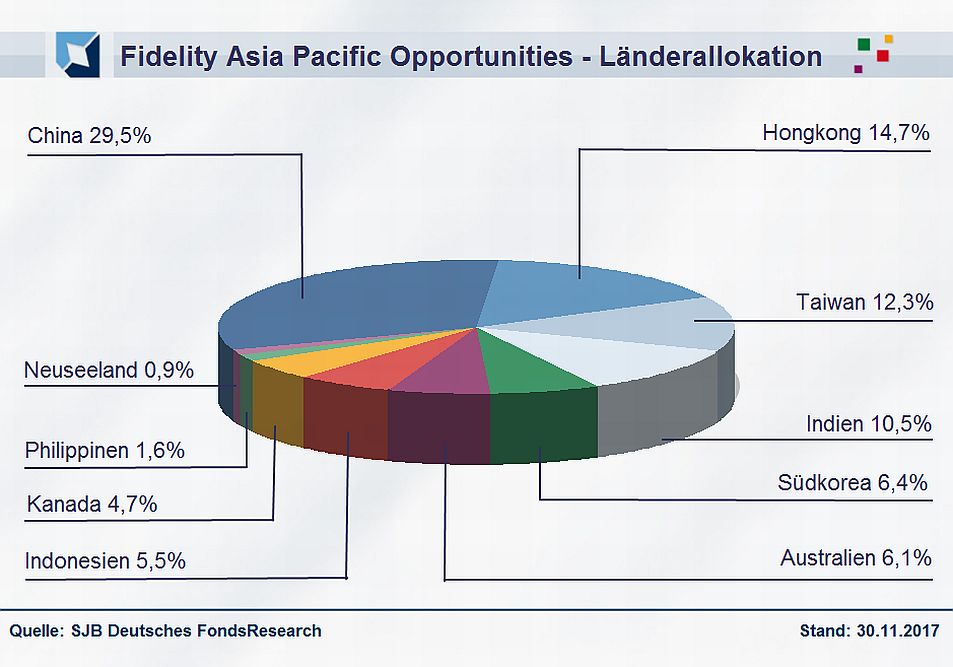 In der Länderallokation des Fidelity Asia Pacific Opportunities Fund liegt die Volksrepublik China mit 29,5 Prozent Anteil am FondsVermögen auf Platz eins. Als zweitgrößte geographische Position folgt Hongkong mit 14,7 Prozent, 12,3 Prozent der FondsBestände sind in Taiwan investiert. Auf Platz vier der Länderaufteilung liegt Indien mit 10,5 Prozent des FondsVolumens. Aktien aus Südkorea besitzen einen Portfolioanteil von 6,4 Prozent, Dividendentitel aus Australien sind mit 6,1 Prozent gewichtet. Aktienanlagen in Indonesien (5,5 Prozent) und Kanada (4,7 Prozent) runden das Länderportfolio des Fidelity-Produktes ab. Kleinere Bestände hält FondsManager Srom zudem auf den Philippinen (1,6 Prozent) sowie in Neuseeland (0,9 Prozent).