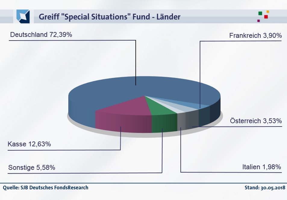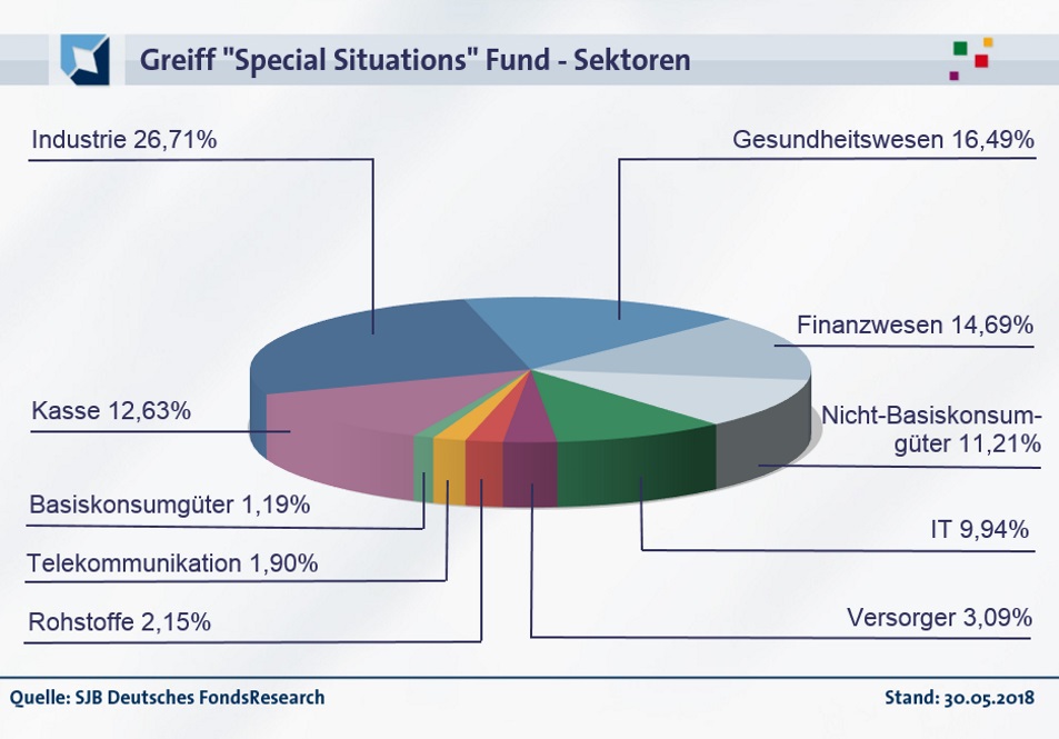 In der geografischen Allokation des Greiff “Special Situations” Fund liegt Deutschland mit einem Anteil von 72,39 Prozent am FondsVermögen unangefochten auf dem ersten Platz. Die anderen Länder fallen weit hinter diese Gewichtung zurück und besitzen lediglich den Charakter einer Beimischung: In Frankreich sind 3,90 Prozent des FondsVolumens investiert, knapp dahinter rangiert Österreich mit 3,53 Prozent. In Italien hat der Greiff-Fonds 1,98 Prozent des Anlagevermögens in Firmen in Sondersituationen investiert, sonstige Länder machen 5,58 Prozent in der Portfoliostruktur aus. Per Ende Mai ist der Cashbestand des FondsProduktes mit 12,63 Prozent recht hoch. In der Sektorengewichtung des Greiff “Special Situations” Fund befinden sich Industriewerte mit 26,71 Prozent Portfolioanteil auf dem ersten Platz. Unter den größten Einzelpositionen des Fonds wird der Bereich durch das deutsche Recyclingunternehmen Alba sowie den Maschinenbauer Homag Group repräsentiert. Titel aus dem Gesundheitswesen nehmen 16,49 Prozent des FondsVolumens ein. Platz drei in der Branchenstruktur geht an Unternehmen aus dem Finanzsektor mit 14,69 Prozent. Durchschnittlich stark gewichtet innerhalb des FondsPortfolios sind Nicht-Basiskonsumgüter (11,21 Prozent) sowie IT-Werte mit 9,94 Prozent. Aktien von Versorgern decken 3,09 Prozent der FondsBestände ab, Rohstofftitel bringen es auf 2,15 Prozent. Abgerundet wird die Branchenstruktur des Greiff-Fonds durch Telekommunikationswerte (1,90 Prozent) und den Sektor der Basiskonsumgüter (1,19 Prozent).
