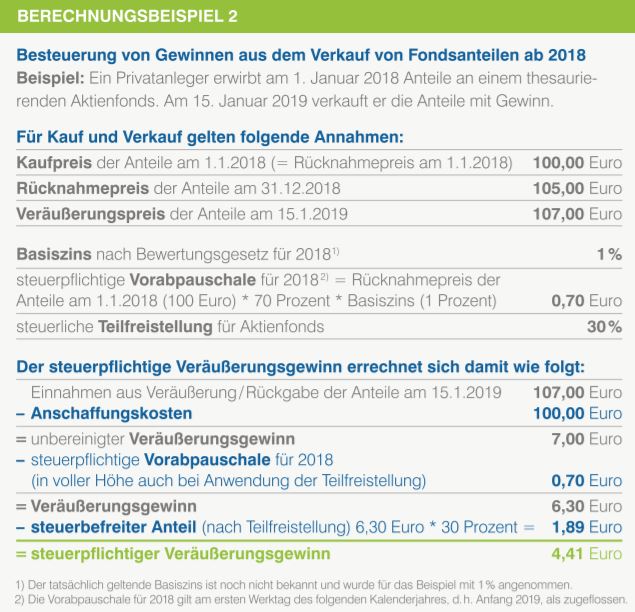 (Beispiel: Basisertrag 5 – Ausschüttung 0 = Vorabpauschale 5). Die Vorabpauschale gilt am ersten Werktag des Folgejahres als steuerlich zugeflossen.