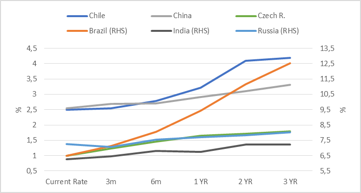 Implizite zukünftige Leitzinsen in SchwellenländernQuelle: Bloomberg, Stand 13. Juli 2018. RHS bedeutet rechte Seite; Grafik: M&G Investments