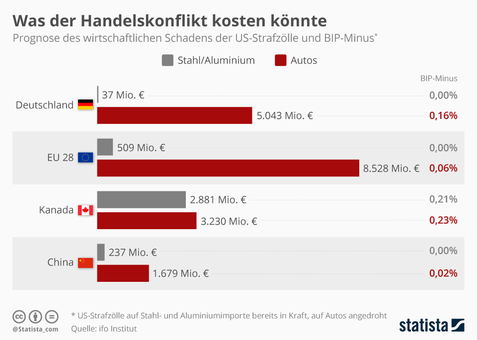 Für Deutschland beispielsweise wäre der wirtschaftliche Schaden in absoluten Zahlen im Falle von Auto-Strafzöllen höher als für China, Kanada oder andere EU-Länder. Gemessen am Bruttoinlandsprodukt wäre Kanada insgesamt am stärksten belastet.