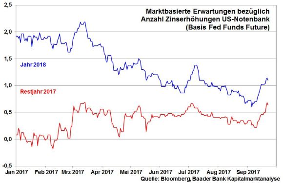 Für die Finanzmärkte bedeutsamer ist die Einschätzung der Fed bezüglich der Leitzinsentwicklung. Zwar hält sie unverändert an einer weiteren Zinsanhebung in diesem Jahr und drei weiteren in 2018 fest. Allerdings betont sie selbst, dass diese Prognose nicht in Stein gemeißelt ist. Die Erfahrung zeigt, dass unter Notenbankpräsident Yellen Abweichungen nach unten der Regelfall sind. So hatte sie für 2016 vier Zinserhöhungen geplant, jedoch nur eine tatsächlich umgesetzt. Denn konjunkturelle und (geo-)politische Risiken sind nicht ausgestorben. So fällt die Frist zur Erhöhung der Schuldenobergrenze in die Zeit der nächsten Fed-Sitzung am 13. Dezember. Und wer weiß, ob Frau Yellen ab 4. Februar Fed-Chefin bleibt oder ob ein taubenhafterer Kandidat den Vorsitz übernimmt? Ohnehin stellt die Fed mittelfristig laut „Dot Plot“ ab 2019 einen flacheren Leitzinsverlauf (2019: 2,7 nach 2,9 Prozent und 2020 2,9 Prozent) in Aussicht. Die Finanzmärkte zeigen sich ohnehin von ihrer Leitzinsprognose nicht vollständig überzeugt und erwarten für nächstes Jahr weiterhin nur eine Erhöhung.