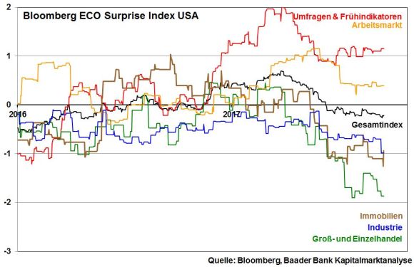 Trotz angehobener Wachstumsprojektionen der Fed (2017: 2,4 statt 2,2 Prozent; 2018: 2,1 Prozent; 2019: 2,0 statt 1,9 Prozent und 2020 1,8 Prozent) sieht die Fed über die nächsten Jahre insgesamt dennoch einen leichten konjunkturellen Abwärtstrend. Tatsächlich signalisiert der von Bloomberg ermittelte Economic Surprise Index – er misst die Abweichungen der tatsächlichen Konjunkturdaten von den zuvor getroffenen Analysteneinschätzungen – eine enttäuschende Konjunkturentwicklung. Während vor allem Frühindikatoren seit Monaten überraschen, unterraschen die harten Daten aus US-Industrie, -Immobiliensektor und -Handel. Sie liegen klar im Enttäuschungsterrain, Tendenz weiter fallend.