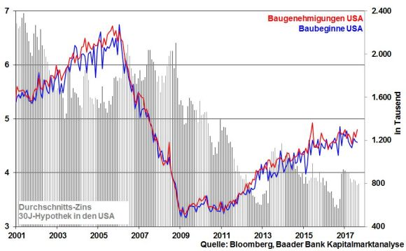 Durchschnittszins 30-jähriger Hypotheken und Baubeginne und -genehmigungen