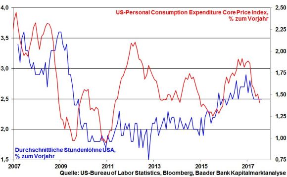 Auf die unterdurchschnittliche Inflationsentwicklung reagiert die US-Notenbank mit teilweise verringerten Projektionen der Kerninflation (2017 1,5 statt 1,7 Prozent; 2018 1,9 statt 2,0 Prozent und 2019 sowie 2020 unverändert bei jeweils 2,0 Prozent). Bei der Inflation insgesamt geht sie nicht davon aus, dass sie ihr Inflationsziel von 2 Prozent vor 2019 erreicht. Für die inflationäre Zielverfehlung sorgt die mangelnde Qualität des vermeintlichen US-Jobwunders, die Globalisierung und die Digitalisierung, die insgesamt lohnseitigen Preisdruck verhindern.