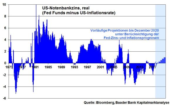 Mit ihrer vermeintlich falkenhaften Geldpolitik wollte die Fed Handlungsfähigkeit und Glaubwürdigkeit beweisen. De facto schont sie aber die US-Konjunktur mit ihrer überschaubaren Bilanzverkleinerung und eher verbalerotischen Leitzinserhöhungsstrategie. Der reale US-Leitzins nach Inflation würde selbst bei Vollausschöpfung der Zinserhöhungsagenda auf absehbare Zeit auf wirtschaftsfreundlich niedrigem Niveau bleiben. Grundsätzlich ist das im historischen Vergleich keine restriktive Zins- und Liquiditätspolitik. Die Gelddrogensucht wird nicht wirklich geheilt. Diese Fed-Politik erinnert an ein Methadon-Programm. Es kann zwar die akuten Abhängigkeiten mildern, aber eine Befreiung von der Sucht ist nicht möglich.