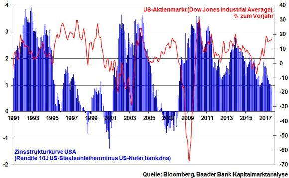 Sicherlich wird durch die Bilanzverkleinerung über die graduelle Erhöhung von Anleiherenditen am langen Ende – bei Vernachlässigung von Leitzinserhöhungen – eine steilere US-Zinsstrukturkurve geschaffen. Diese würde amerikanischen Banken verstärkte Anreize geben, Fristentransformation zu betreiben: Geld wird zu günstigen Notenbankzinsen ausgeliehen und zu höheren Kreditzinsen weitergegeben. Das stabilisiert eine schuldentrunkene Volkswirtschaft wie die der USA und stützt sogar die US-Aktienmärkte fundamental.