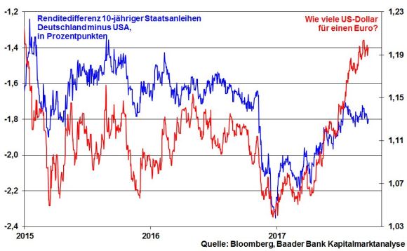 Zinsdifferenz 10-jähriger Staatsanleihen Deutschland minus USA und Wechselkurs Euro/US-Dollar
