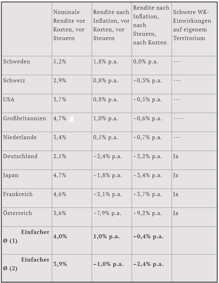Die angegebenen Renditen sind geometrische annualisierte Durchschnitte. /// „WK“ bezieht sich auf die beiden Weltkriege. Diese haben in den in der rechten Spalte mit „Ja“ gekennzeichneten vier Ländern zu ganz besonders schwerwiegenden Zerstörungen des volkswirtschaftlichen Kapitalstocks, der Staatsfinanzen und des Währungssystems geführt, weswegen in diesen Ländern die realen Geldmarktzinsen im Durchschnitt der letzten 118 Jahre extrem niedrig bzw. negativ waren. /// Steuern: Pauschaler Steuersatz von 30% auf die Nominalrendite unterstellt. /// Kosten: Fixe Kostenbelastung von 0,2% p. a. angenommen. /// Quelle der Rohdaten (Spalten 2 und 3): Dimson, Marsh, Staunton: „Credit Suisse Global Investment Returns Yearbook 2018“, Februar 2018. Zahlen in Spalte 4 von der Gerd Kommer Invest GmbH berechnet. /// (1) Einfacher Durchschnitt der fünf Länder ohne „Ja“ in der rechten Spalte. /// (2) Einfacher Durchschnitt aller neun Länder.