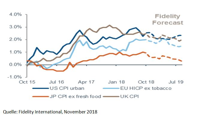 Auch wenn 2019 die Inflation das zentrale Risiko sein sollte, ist nicht mit einem deutlichen Preisauftrieb zu rechnen. Bei einer unerwartet starken Konjunktur in den USA können die Löhne zwar anziehen. Da die Produktivität parallel dazu nach oben tendiert, sollte der Inflationsdruck verhalten bleiben – vorausgesetzt, es kommt zu keinem deutlichen Schub bei den Rohstoffpreisen.