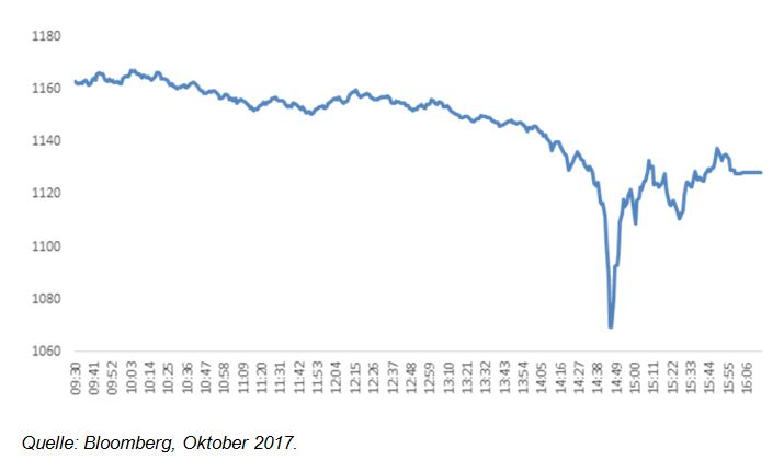 Grafik 2: Vollautomatisierte Handelssysteme werden auch für den Kurseinbruch 2010 beim S&P 500 um rund sechs Prozent in gerade einmal 20 Minuten verantwortlich gemacht