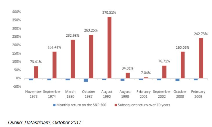 Grafik 3: Auf acht der zehn schlimmsten Kurseinbrüche im S&P 500 in einem Monat folgten starke Erträge in den nächsten zehn Jahren