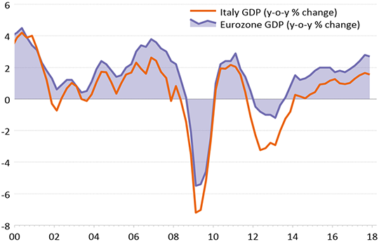 Der große Anteil an notleidenden Krediten war nicht die Folge einer platzenden Blase wie in Spanien und Irland, sondern ist eher ein schwelendes Problem aufgrund des anhaltend niedrigen Produktivitätswachstums. Eine niedrige potenzielle BIP-Wachstumsrate, die auf einem niedrigen Produktivitätswachstum basiert, ist Italiens Hauptproblem. In den 1970er und 1980er Jahren konnte Italien fehlende Strukturreformen durch eine fiskalische Expansion und eine Abwertung der Lira ausgleichen. Das hielt die Nachfrageseite der Wirtschaft in Gang und hatte auch angebotsseitig einige positive Auswirkungen. Seit Mitte der 1990er Jahre sind jedoch Strukturreformen die einzige Option.