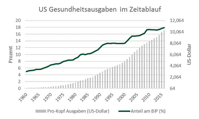 Nach Berechnungen der amerikanischen Centers for Medicare & Medicaid Services (CMS) stiegen die Gesundheitsausgaben im Jahr 2016 um 4,3% auf US-Dollar 3,3 Billionen an, welches pro-Kopf Ausgaben von US-Dollar 10.348 entspricht. Damit einhergehend stieg der Anteil der US Gesundheitsausgaben am BIP auf 17,9% im Jahr 2016, von 17,7% im Vorjahr.