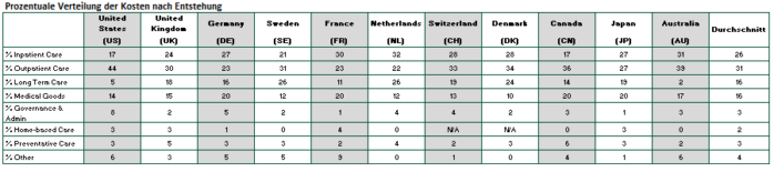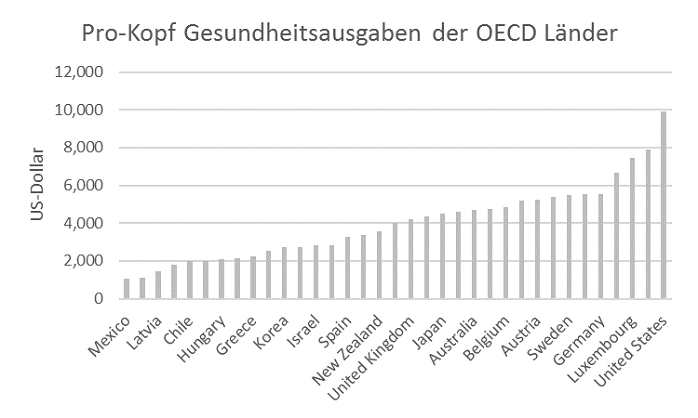 Auch im Vergleich mit anderen OECD Ländern (Jahr 2016), liegen die USA bei den Pro-Kopf-Gesundheitsausgaben eindeutig an der Spitze. Im Durchschnitt geben Industrienationen wie z.B. Australien, Deutschland, Frankreich, Japan, Kanada und das Vereinigte Königreich etwa halb so viel (US-Dollar 5.000 pro Kopf) für Gesundheit aus.