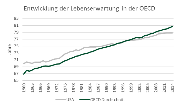 Bei so hohen Ausgaben wäre zu erwarten, dass die Lebenserwartung der Amerikaner über der der Vergleichsgruppe liegt. Dies ist aber spätestens seit Ende der neunziger Jahre nicht mehr der Fall, denn in den letzten Jahren stagnierte die Lebenserwartung der US Bevölkerung zwischen 78 und 79 Jahren, während sie im OECD-Durchschnitt weiter anstieg und zur Zeit bei fast 81 Jahren liegt.