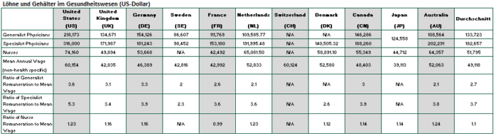 So verdienen Fachärzte in den USA doppelt so viel wie z.B. in Deutschland und Großbritannien. Auch Allgemeinärzte und das Pflegepersonal werden im Vergleich zu anderen Industrienationen besser entlohnt. Arzneimittelpreise in den USA sind mit pro-Kopf Ausgaben von ca. 1.400 US-Dollar zudem doppelt so hoch wie in anderen Industrienationen, obwohl das Land bei der Einnahme von sehr preisgünstigen Nachahmerprodukten (Generika) einen Spitzenplatz einnimmt.