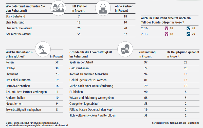 Als Folge sind die Menschen auch im Ruhestand noch aktiv. Viele treten in die Rente ein, weil sie ihre Freizeit genießen wollen. Das Reisen steht dabei an oberster Stelle. Aber auch mehr Zeit für Hobbys oder Ehrenämter, Enkel oder Partner wollen Ruheständler heute haben (siehe Grafiken).