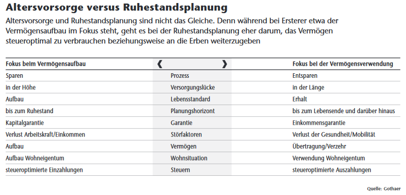 An erste Stelle der Ruhestandsplanung, bevor an Produkte überhaupt zu denken ist, gehört dabei die ausführliche Analyse. Der Ruhestandsplaner muss Gesamtvermögen, die Liquidität zu Beginn des Ruhestands und das Sicherheitsbedürfnis des Kunden bei der Kapitalanlage in Zusammenhang mit der familiären Situation klären.