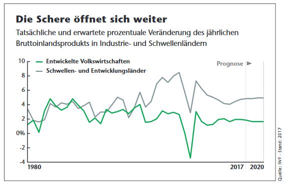 In den Jahren nach der Finanzkrise hat sich die Weltkonjunktur erheblich verlangsamt. Doch während die Industrieländer zurücksteckten, zeigte sich in den Schwellenländern ein Licht am Horizont. Und trotz der Unsicherheit, die nach den letztjährigen Überraschungen beim Brexit-Votum und der US-Präsidentschaftswahl zurzeit herrscht, wuchs das Bruttoinlandsprodukt (BIP) in den Schwellenländern 2016 um 4,1 Prozent gegenüber 1,7 Prozent in Industrieländern. Der Internationale Währungsfonds (IWF) erwartet doppelt so viel Wachstum in den Schwellen- und Entwicklungsländern in den Jahren 2017 und 2018 wie in den entwickelten Volkswirtschaften (jeweils 4,5 Prozent beziehungsweise 4,8 Prozent gegenüber rund 2 Prozent). Aktuell sind die Schwellenländer für mehr als 75 Prozent des globalen Produktions- und Konsumwachstums verantwortlich. Der IWF schätzt sogar, dass ihr Anteil am globalen BIP (in US-Dollar) von derzeit 38,8 Prozent auf 60 Prozent im Jahr 2035 steigen wird.