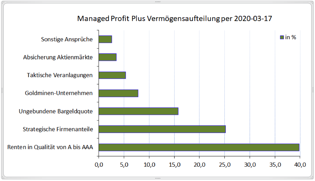 Bevor wir gemeinsam in die „Neue Zeit“ eintauchen, erlauben Sie mir einen Blick zurück. Der NAV des Managed Profit Plus (kurz: MPP) vergünstigte sich im Februar um 3,50%. Die Netto-Aktienquote betrug damals per Monatsende knapp 63%, davon waren rund 12% in fünf Goldminen-Unternehmen investiert, die wichtigsten drei scheinen im MPP Factsheet auf, das sich per Mausklick MPP Factsheet 2020-02 herunterladen lässt. Derzeit sieht es so aus: