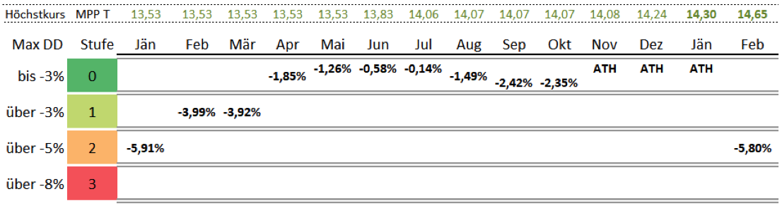 Der letzte absolute Höchstkurs des MPP (T) lag per 21.02.2020 bei 14,65 Euro und wird so lange weitergeführt, bis ein neues Allzeithoch (ATH) erreicht wird. Per Ende Jänner 2019 lag der Fondspreis des MPP (T) bei 12,73 €uro und der berechnete MaxDD bei -5,91%, den Sie in der Stufe 2 eingetragen sehen. Per 29.02.2020 ergibt sich der MaxDD bei 5,80%.