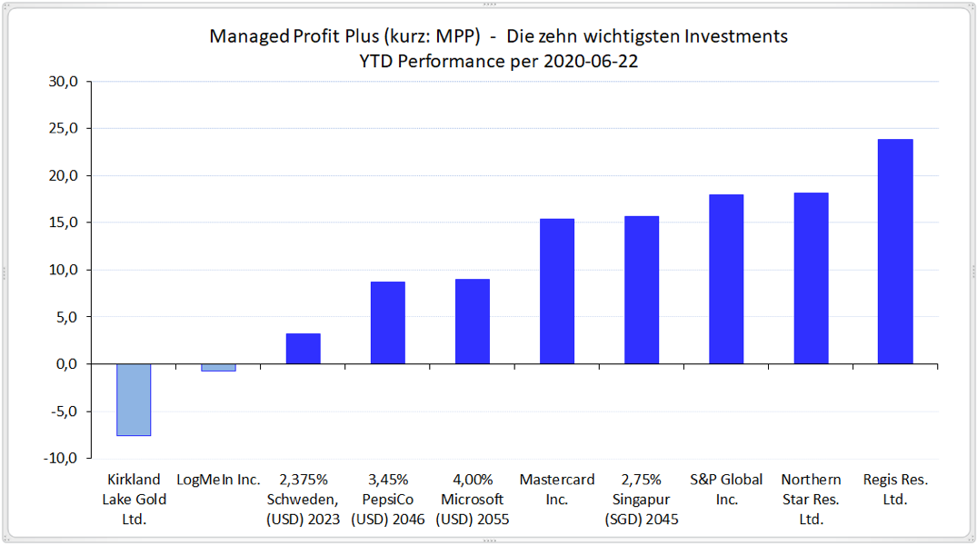 Im Monat Mai verteuerte sich der NAV des MPP um 4,99%. Investments in Firmenanteile wurden auf 56,82% erhöht, wobei rund 90% als taktische Investments klassifiziert werden, gemäß Beschreibung im letzten MPP Newsletter. Knapp 33% der Fondsgelder waren per Stichtag in hochwertige Unternehmens- und Staatsanleihen investiert. Die exakte Vermögensstruktur finden Sie im MPP Factsheet 2020-05.
